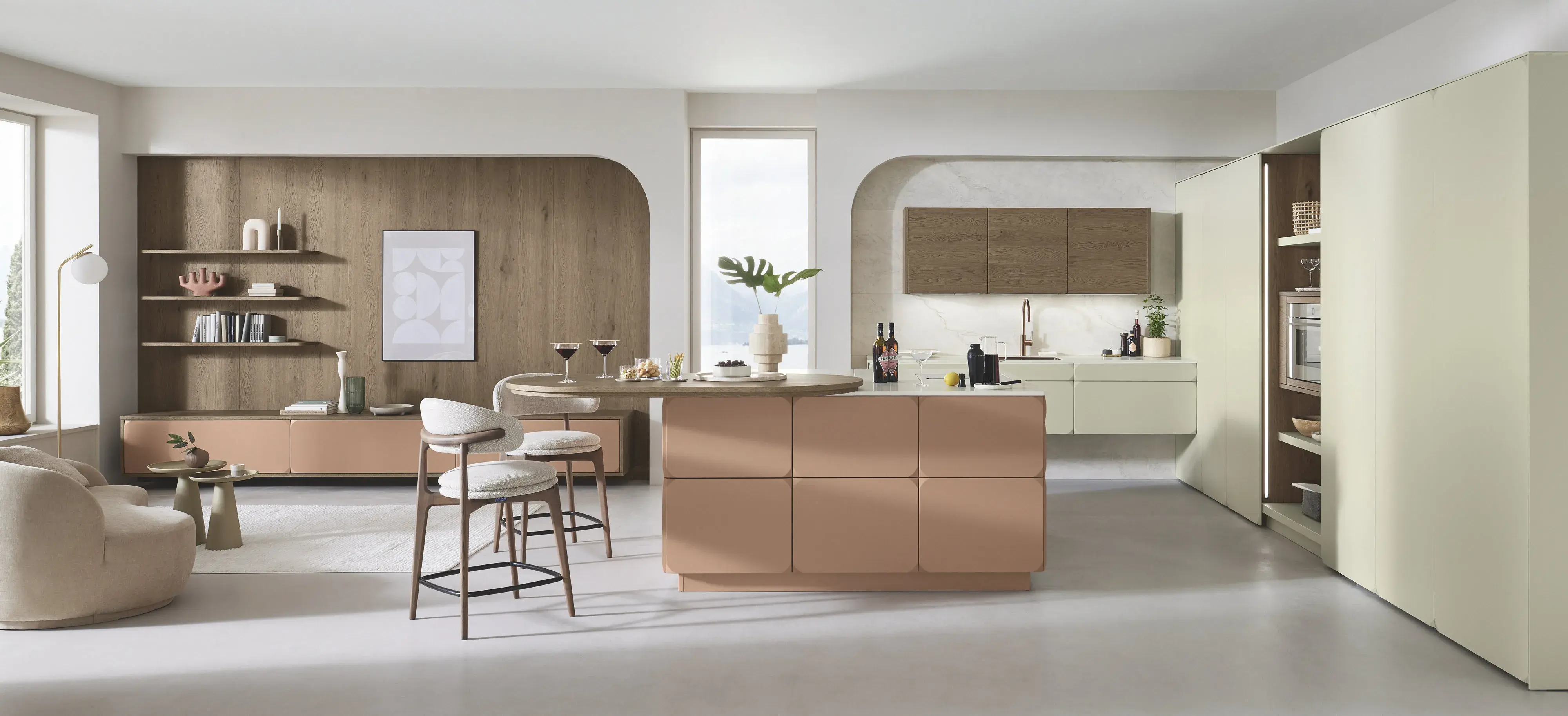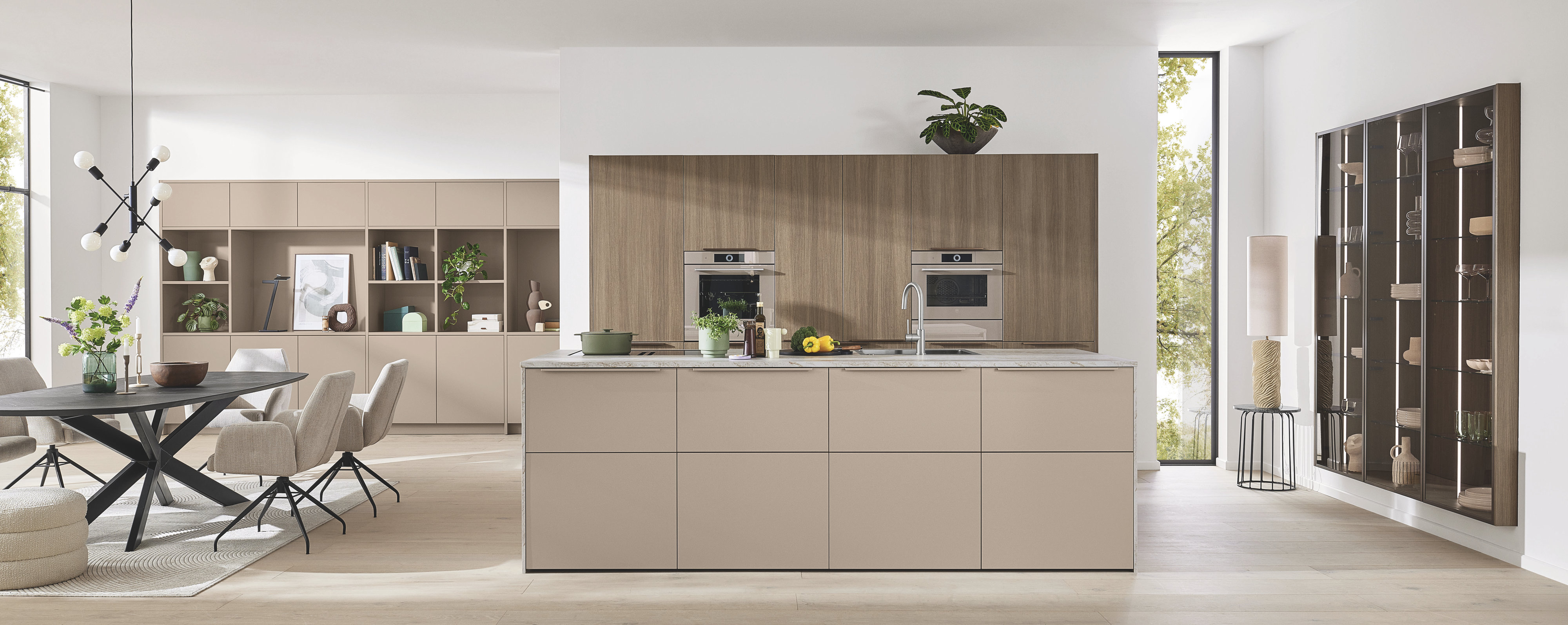 Auszüge und Schubkästen mit den Holzeinsätzen in Esche dunkel, bringen optimalen Stauraum. Ideale Aufbewahrung von Brot oder Gemüse bietet die Pantry-Box. Das beleuchtete FREEBOARD unterstreicht die Optik der Akustikwand. Das klassische Regal bildet den idealen Übergang zum Wohnraum: