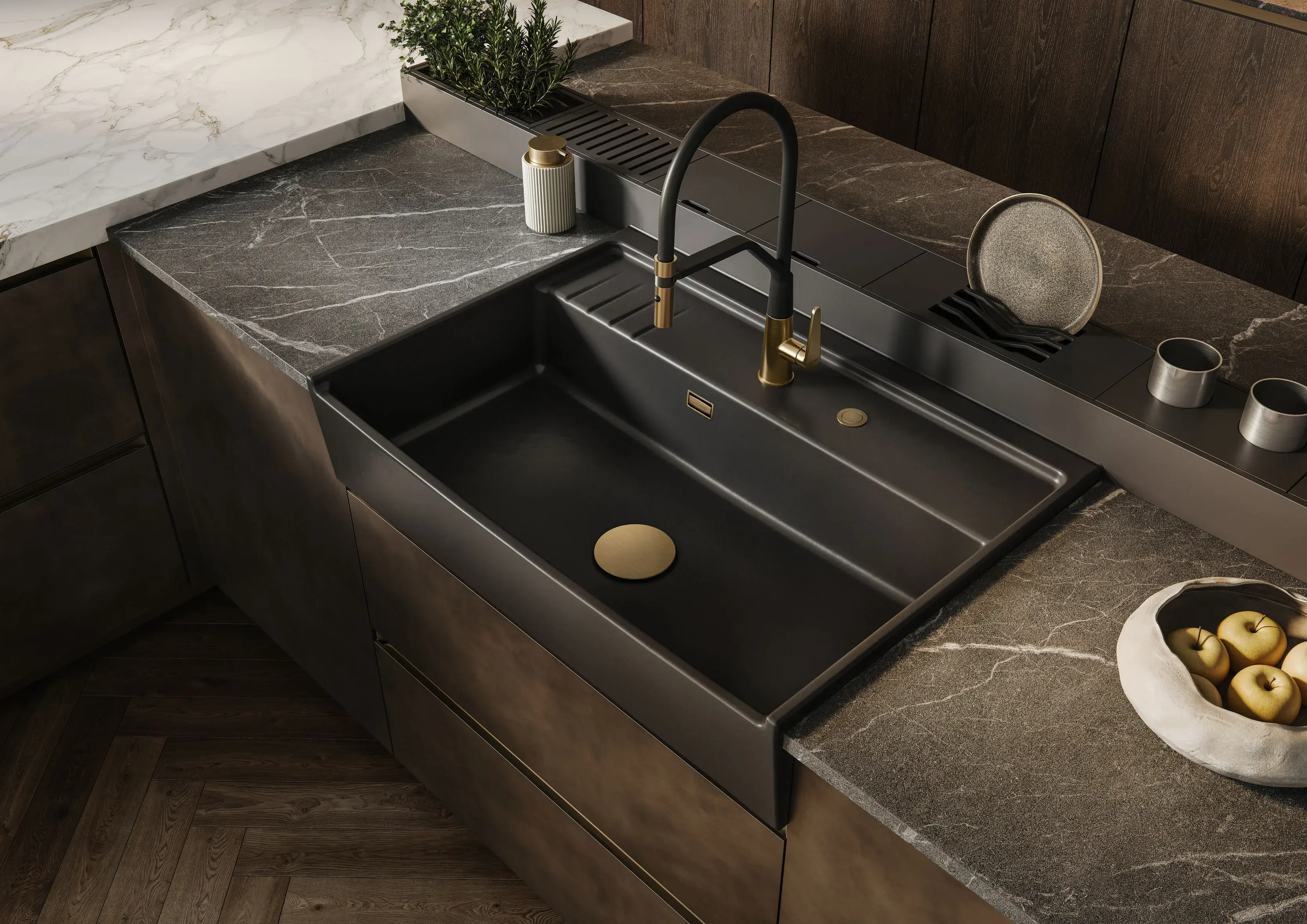 Feinsteinzeug-Spülen sind aufgrund ihrer Materialeigenschaften außerordentlich robust. Für viele Jahre und, wer mag, für viele Generationen. systemceram produziert enorm widerstandsfähiges Feinsteinzeug, das sogar die hohen Anforderungen für Laboreinrichtungen erfüllt. Auf der gleichen Qualitätsbasis bietet der Keramikspezialist Spülen und Arbeitsplatten für Einbauküchen und Bäder an. Das Sortiment wird ständig weiterentwickelt. Sogar Maßanfertigungen sind möglich. Für den wichtigsten Arbeitsplatz in der Küche kann die Palette nicht groß genug sein: Egal welche Form, Abmessung, Farbe, Einbauvariante. systemceram bietet auch ganz individuelle Lösungen.